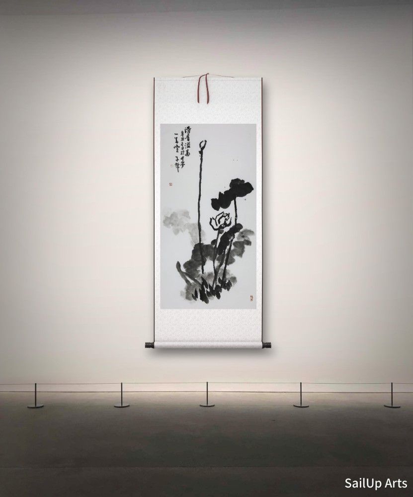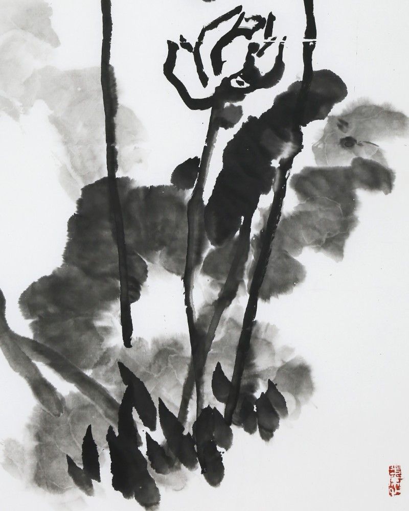 This ink painting of lotus flowers was created by Mr. Chen Zilin. The work captures the purity and spirit of the lotus through simple yet powerful brush strokes, demonstrating the unique charm of ink painting. In this painting, the lotus flowers and leaves are depicted in stark black and white contrast. The deep ink not only outlines the thickness of the leaves and the contours of the lotus flowers but also uses varying shades to show the layered and dynamic beauty of the leaves on the water surface. The buds, blooming flowers, and elegant stems of the lotus are sketched with expressive lines, vividly conveying the vitality of life and the harmonious beauty of nature. The inscription "清香溢远" (Fragrance Spreads Far) suggests the fresh and sublime scent of the lotus, symbolizing purity and a transcendent attitude. The entire work is not only an ode to natural beauty but also an aspiration and longing for the finer qualities in life. Overall, this piece, through masterful brushwork and profound artistic expression, successfully conveys the symbolic spirit and aesthetic appeal of the lotus, providing viewers with an extraordinary visual and spiritual experience.
