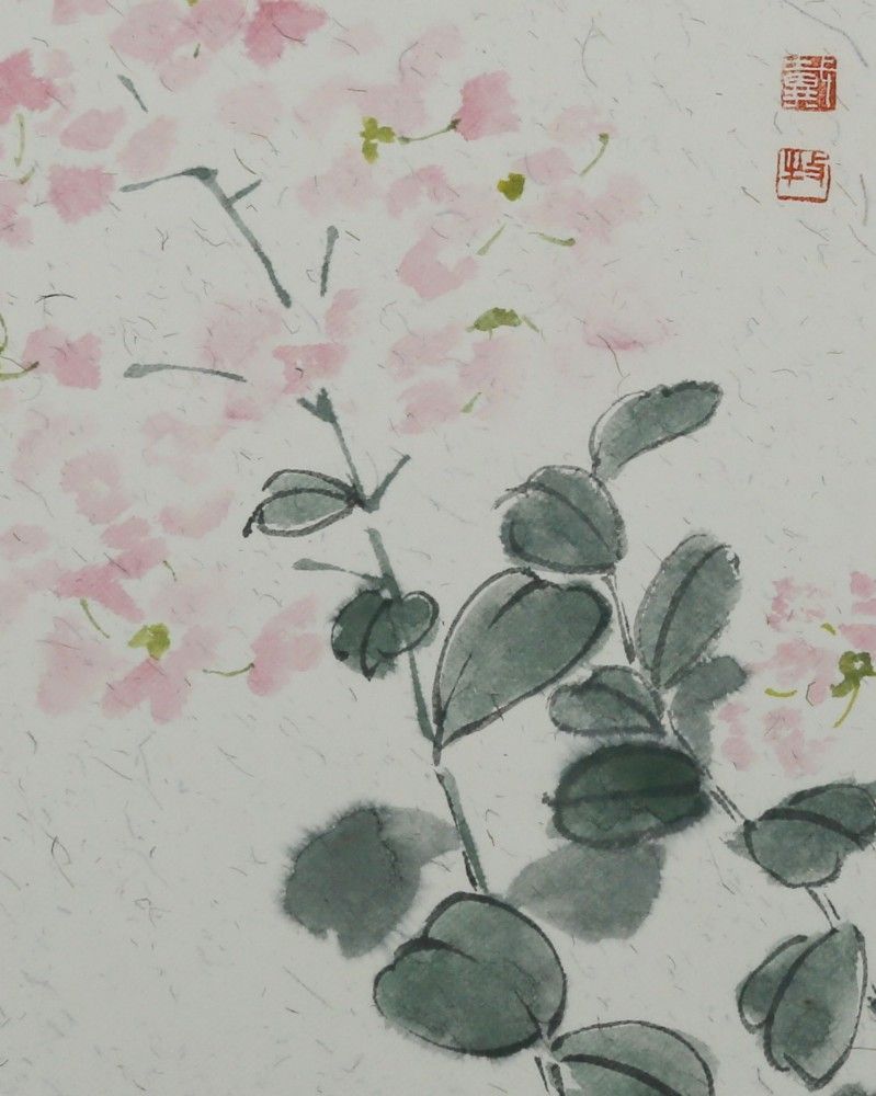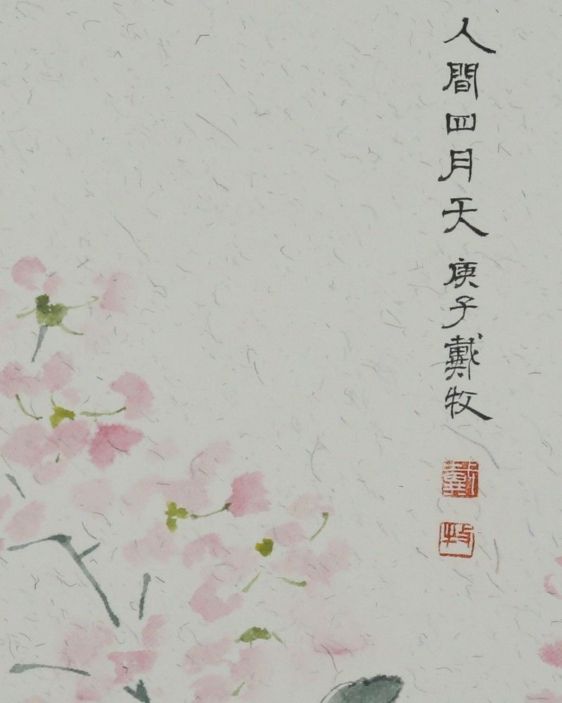 This circular Chinese painting titled "Spring Flowers" was created by Dai Mu in the Gengzi year. The artwork features light red spring flowers scattered throughout the canvas, creating a vivid contrast with the dark green leaves. The composition is simple yet vibrant, with the light red blossoms acting like messengers of spring, delicately interspersed among the green leaves, displaying the lively scenes of spring. The inscription "人间四月天" (A Human World in April) in the painting provokes deep reflection. This phrase not only describes the natural beauty depicted in the painting but also conveys the joy and hope that spring brings to people. Dai Mu captures the delicate texture of the flowers and the vivid shapes of the leaves with his fine brushwork, demonstrating his exquisite skill in depicting natural details. Furthermore, the technique of leaving white space in the painting gives the entire work a fresh and refined appearance, providing viewers with ample space for imagination. Overall, Dai Mu's "Spring Flowers" is not only a tribute to the natural beauty of spring but also a conveyance of mood and emotion, allowing one to feel the warmth of spring and the hope of life.