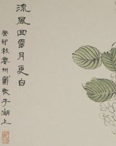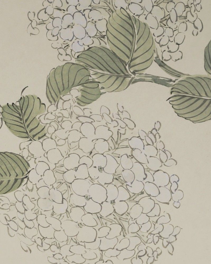This painting, titled "Snow-colored Hydrangea," depicts a cluster of hydrangea flowers, closely packed and delicately formed, their color resembling snow white, contrasting with the green leaves in the painting to enhance the visual depth. The petals of the hydrangea are thin and translucent, resembling light snowflakes, filled with a soft and fresh aura. Beside the painting, the inscription "流風回雪月更白" (The wind returns the snow, making the moon even whiter) poetically describes how the flowers appear even more immaculately white as if brushed by a gentle breeze, expressing the purity and tranquility of the natural landscape. This verse not only elevates the artistic realm of the painting but also deepens the viewer's experience of the scene. Overall, the composition of the painting is simple yet exquisite. Dai Mu uses delicate brushwork and controlled ink techniques to perfectly capture the unique beauty and natural elegance of the hydrangea.