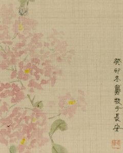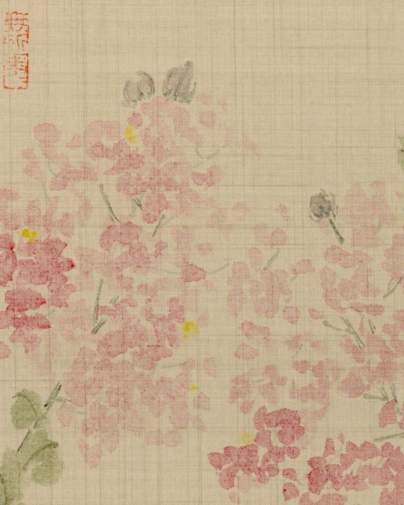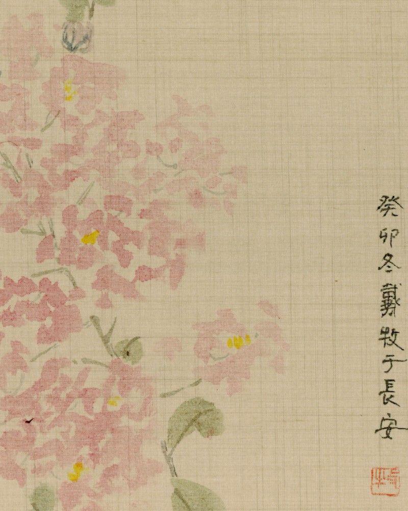 The flowers depicted in this painting are Crape Myrtle (Lagerstroemia), known for their delicate blossoms and bright colors. Crape Myrtle flowers are typically pink and gather densely at the tips of branches, forming lush clusters. In the painting, the flowers are rendered in soft shades of pink with richly layered petals, paired with green leaves, overall presenting a vivid and elegant natural beauty.