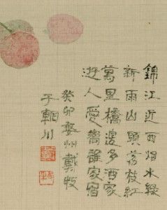 錦江近西煙水綠, 新雨山頭荔枝紅。 萬里橋邊多酒家, 遊人愛向誰家宿。 癸卯,婺州戴牧於輞川