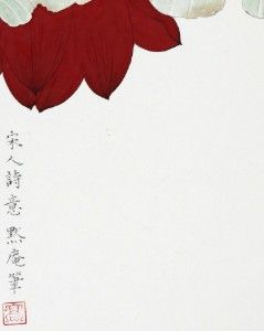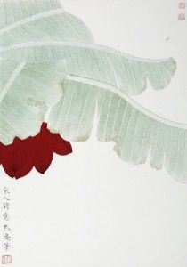 This painting, titled "Banana Blossom," was meticulously created by the artist Gao Ke, showcasing his unique artistic style and exquisite attention to detail. The banana blossom in the painting is presented in a vibrant red, contrasting with the calm green leaves, giving the artwork a clear division of colors and a rich layering. The leaves of the banana plant are depicted with vividness, and the veins are clearly defined, conveying a sense of the leaves' flexibility and vitality. The background of the painting is kept blank, focusing the viewer's attention entirely on the banana blossom and leaves, further emphasizing the theme. The inscription "宋人詩意" (Song Dynasty Poetic Sentiment) indicates that this work was inspired by the poetry of the Song dynasty, reflecting the poets' deep emotional connection and unique aesthetic appreciation of the natural landscape. This piece is not only a capture of the beautiful posture of the banana blossom by the painter but also a tribute to Song dynasty poetry and natural aesthetics, making this painting not only visually engaging but also worthy of profound contemplation.