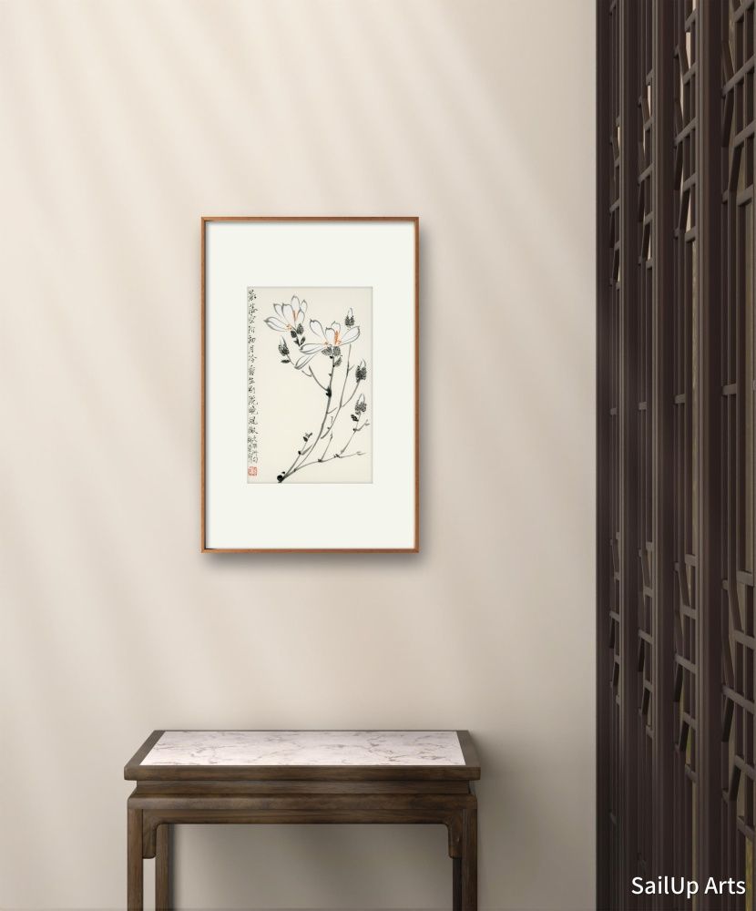 This is one of the twelve pages from the album titled "Flowers of Prosperity" created by Mr. Li Hongzhao. This painting exquisitely captures magnolia blossoms using the ink painting technique. The style is fresh, with light ink outlining the petals and orange-red embellishments on the stamens, displaying the flower's elegance and intricacy, and showcasing the natural beauty and vitality of the magnolia. The inscription quotes a poem by Wen Tong from the Song Dynasty: "Shadows fall on empty steps as the early moon chills, fragrance rises in the separate courtyard with the evening breeze slight." This not only adds a poetic and narrative quality to the painting but also expresses a subtle sense of longing and separation. The verse describes the tranquil beauty of magnolia blossoms under moonlight and evening breezes, perfectly complementing the theme of the painting. This artwork is not only an artistic capture of natural beauty but also a modern interpretation of classical poetic emotions, suitable for art lovers and collectors who appreciate and collect Chinese ink paintings. This set of album pages can be collected individually or as a complete set of twelve pages. If purchased as a whole, the twelve paintings will be housed in a hard case with a cover title.