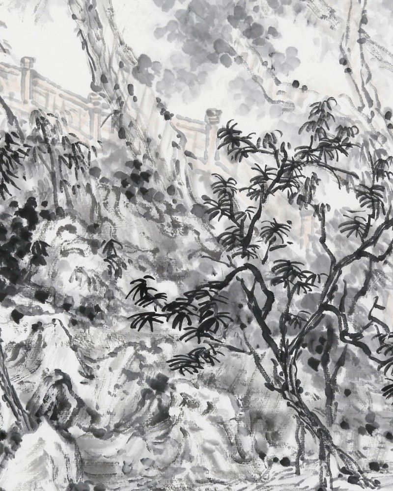 This painting was created by the talented young artist Molijia. The work showcases Molijia's exquisite ink painting skills and deep understanding of natural landscapes. In this piece, trees and shrubs are delicately rendered against a dense forest background, creating a strong contrast between the foreground and background. The trees in the painting are lush with foliage, the brushstrokes are meticulous, and the ink tones are rich and layered, fully demonstrating the artist's technique. Molijia employs traditional brush techniques combined with innovative composition methods to create a scene with depth and spatial perception. The bridge in the painting is faintly visible, adding to the sense of layering and profundity of the scene. The overall image exudes a tranquil and harmonious atmosphere, making the viewer feel as if they are immersed in nature, experiencing the unique charm of classical Chinese landscape painting. This work not only showcases Molijia's artistic talent but also reflects his love for nature and keen observation.