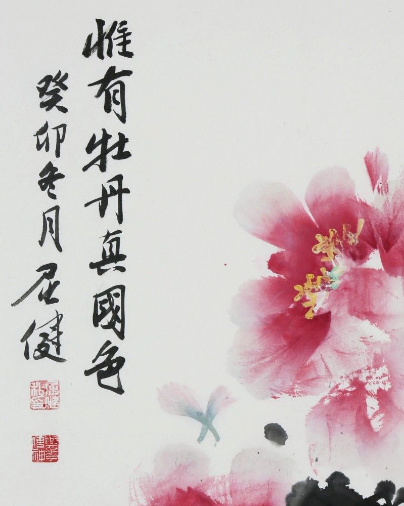 This ink painting titled "Peony" was created by Qu Jian and showcases the vivid and elegant beauty of the peony flower. In the painting, the peonies are brightly colored with clearly defined petal layers, brimming with vitality, while the dark leaves create a strong visual contrast, making the flowers stand out even more. The inscription "Only the peony is the true beauty of the nation" emphasizes that the peony is not only beautiful but also symbolizes wealth and prosperity, reflecting the special reverence for this flower in Chinese culture.