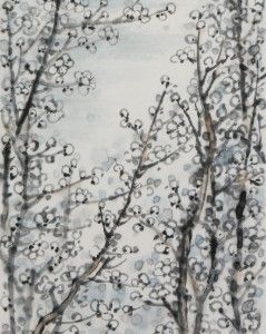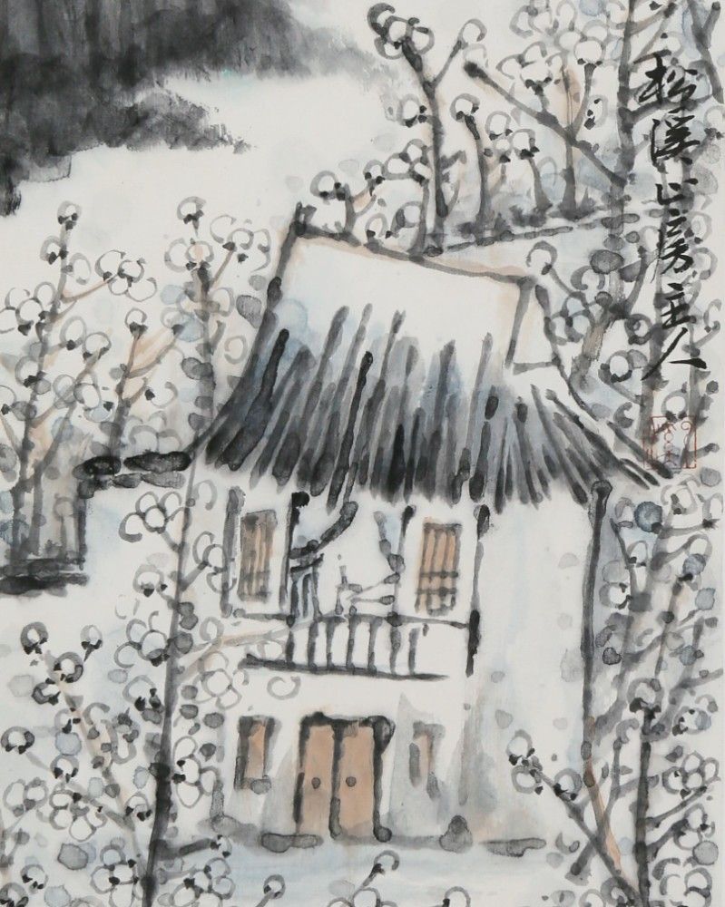 This painting titled "Reading in the Plum Grove" was created by the talented young artist Wang Yi, depicting a serene winter scene in a plum grove. The cottage, nestled among lush plum trees and backed by majestic mountains, evokes a sense of escaping the hustle and bustle and returning to nature. The plum trees are dense with branches and delicately depicted blossoms, showcasing the artist's exquisite skill in painting flowers and birds. Wang Yi skillfully utilizes the techniques of ink wash and negative space in his work, maintaining the ethereal and translucent quality characteristic of ink paintings. The distant mountains are lightly rendered, adding depth and expansiveness to the scene. The design of the cottage is simple yet poetic, with the warm light from the windows suggesting the cozy life of reading quietly inside. This painting is not only a vivid portrayal of natural beauty but also reflects the artist's longing and praise for a tranquil lifestyle. The plum grove and cottage symbolize an ideal of reclusive living, providing viewers with a sense of spiritual purification and peace, allowing one to feel the unique tranquility and poetic charm through the artwork.