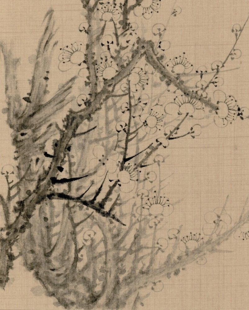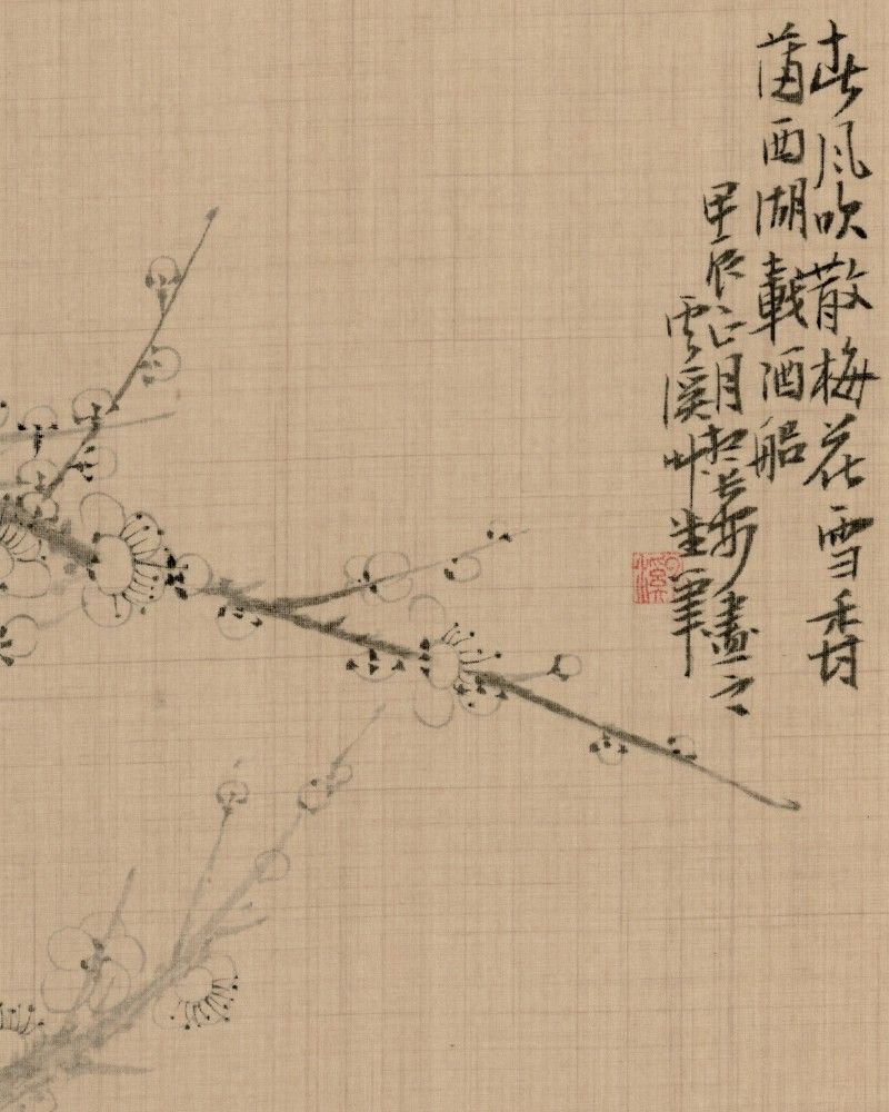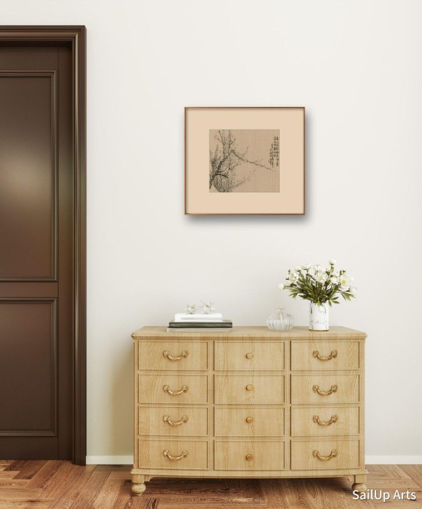 This ink painting of plum blossoms exhibits a high level of artistic achievement and poetic expression, conveying the proud beauty of plum blossoms at the end of winter and the start of spring. The branches of the plum tree in the painting are twisting and powerful, and the flowers are sparse and refined. Through the delicate ink brushstrokes, the resilience and purity of the plum blossoms are depicted. This style not only captures the natural form of the plum blossoms but also embodies deep cultural symbolism. The inscription next to the painting, "Spring wind scatters the snow-like plum blossoms; fragrance fills West Lake with wine-laden boats," is rich with poetic imagery and tells a story beyond just depicting a scene. These words paint a picture of the spring breeze gently blowing, scattering the plum blossoms like snowflakes, their fragrance pervading the entire West Lake, accompanied by boats carrying wine, creating a vivid and romantic tableau.
