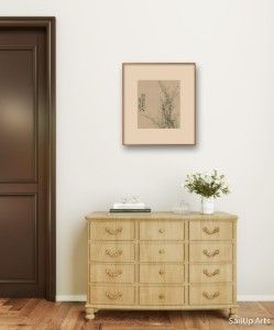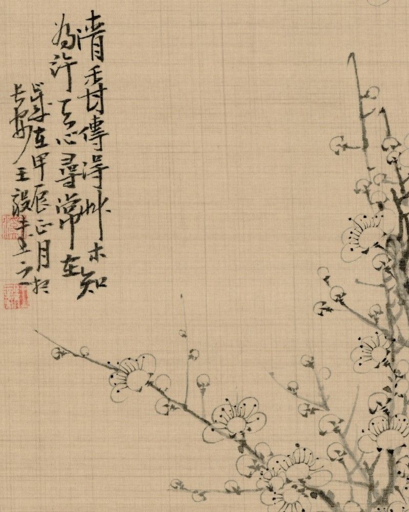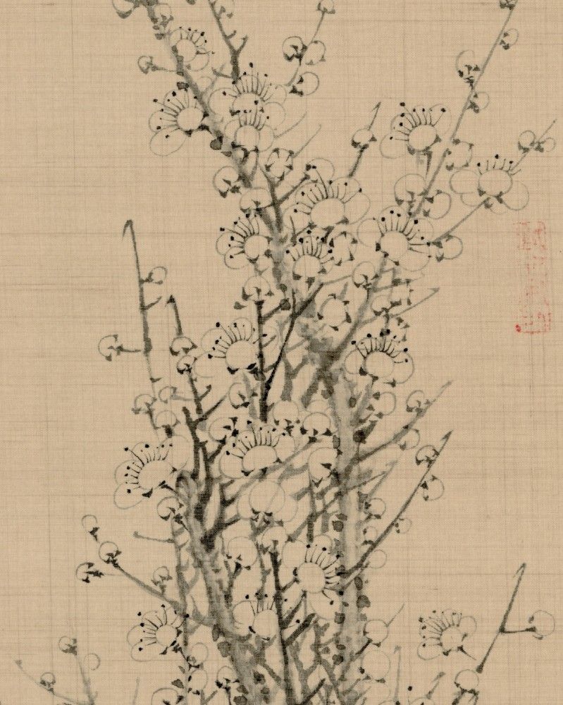 This ink painting of plum blossoms captures the essence of the flowers with delicate and elegant brushstrokes, demonstrating a high level of traditional Chinese painting techniques. In the painting, the plum branches are robust and forceful, extending upwards, with the blossoms sparse and refined.