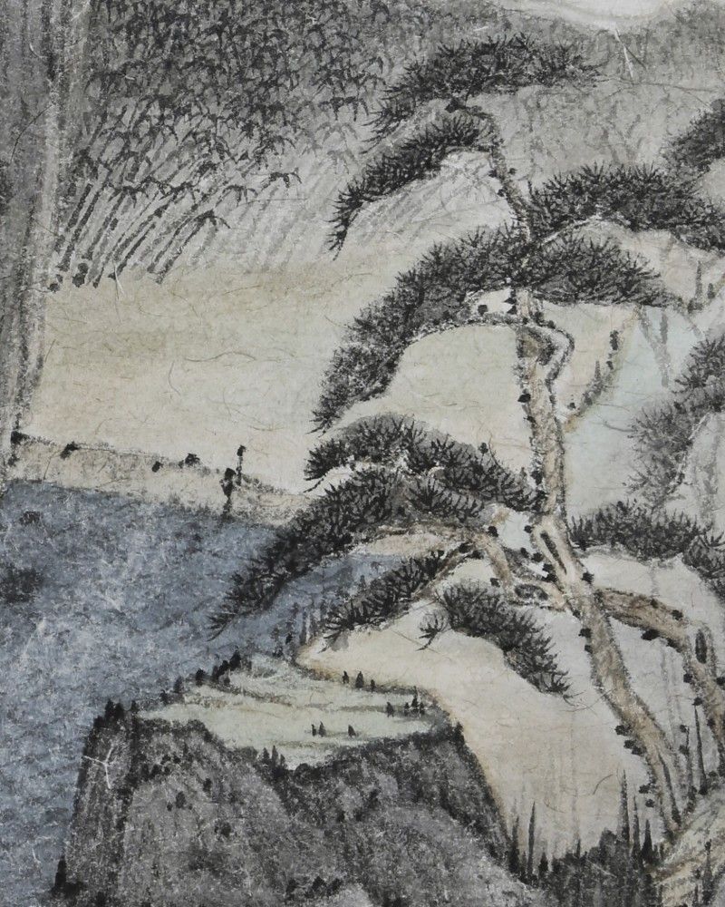 In this painting, the artist utilizes a unique perspective and exquisite ink painting techniques to depict steep mountains, winding rivers, and ethereal mists, creating a serene and profound artistic atmosphere. In the scene, the sharp cliffs contrast with the soft clouds, while pine trees stand resiliently among the mountains, symbolizing perseverance and vitality. The river is depicted in vibrant blue hues, adding a sense of tranquility and mystery. The details in the painting are meticulously handled, from the textures of the rocks to the lines of the pine needles, each stroke revealing the artist's profound skill and deep appreciation for the beauty of nature. The artwork is not only a representation of natural landscapes but also an expression of the soul and a longing for a peaceful life. Through this piece, viewers can experience a sense of transcendent calm and the harmonious coexistence of pine trees and mists in nature. This painting deeply explores the concept of nature in Chinese traditional culture, showcasing a perfect integration of nature and human spirit, making it worthy of collectors' attention.