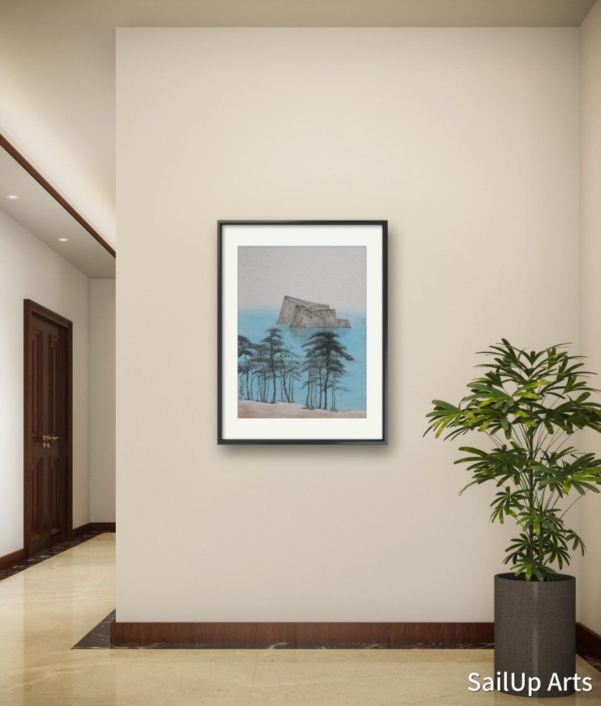 This is one of the works from the "Mountains and Sea" series. The series, with its unique perspective and vivid color contrasts, captures the harmony and poetry between mountains and waters. These four paintings utilize a deep blue sea as the backdrop, highlighting the upright pines on isolated islands and the lush greenery on cliffs, blending ink with color to create a serene and profound beauty. Each element in the paintings is imbued with symbolic meaning: the pine trees represent resilience, while the distant mountains symbolize eternity and peace. These natural landscapes are not only a visual delight but also provoke deep reflection on nature and life's philosophies. The artist uses simple yet powerful lines and clearly defined colors to create one dreamlike scene after another. The entire series, through its meticulous techniques and profound artistic conception, not only showcases the traditional beauty of Eastern landscape paintings but also integrates modern innovative elements. Each painting displays a unique artistic style and deep cultural significance, leading viewers into a tranquil and profound natural world. We are offering these four works for sale individually, but displaying them together would further highlight their artistic allure.
