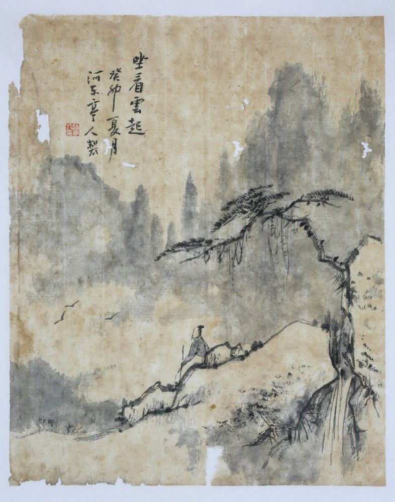 This piece, "Watching the Clouds Rise," depicts a scholar sitting in the mountains, quietly observing the rising mist. The entire painting is filled with a serene and distant atmosphere, with the mountain peaks in the background faintly visible, creating a mysterious aura. The pine tree behind the figure is robust and elegant, complementing the landscape in the background. The artist uses concise brushstrokes and light ink to fully capture the essence of traditional Chinese landscape painting. His style not only inherits the elegance of ancient literati paintings but also incorporates his meticulous observation of nature and modern aesthetic understanding, giving the work a contemporary feel and artistic charm. This piece was created in 2023 but uses ancient paper, retaining its worn edges. This intentional preservation of the paper's imperfections enhances the painting's mood in a uniquely effective way, making it a highly collectible work.