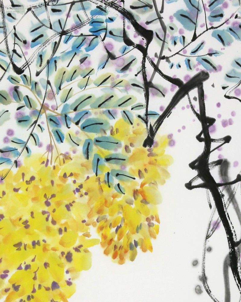 This painting depicts a blooming wisteria, with cascading clusters of wisteria flowers in bright colors, full of vitality. The newly blossomed wisteria flowers are depicted in vibrant yellow and purple, while the leaves are rendered in varying shades of light green, highlighting the vividness of the flowers. The wisteria branches are expressed in different intensities of ink. The inscription reads: "Spring's message. Autumn day of the Renyin year, by Qulu," indicating that the theme of the painting is to convey the arrival of spring.